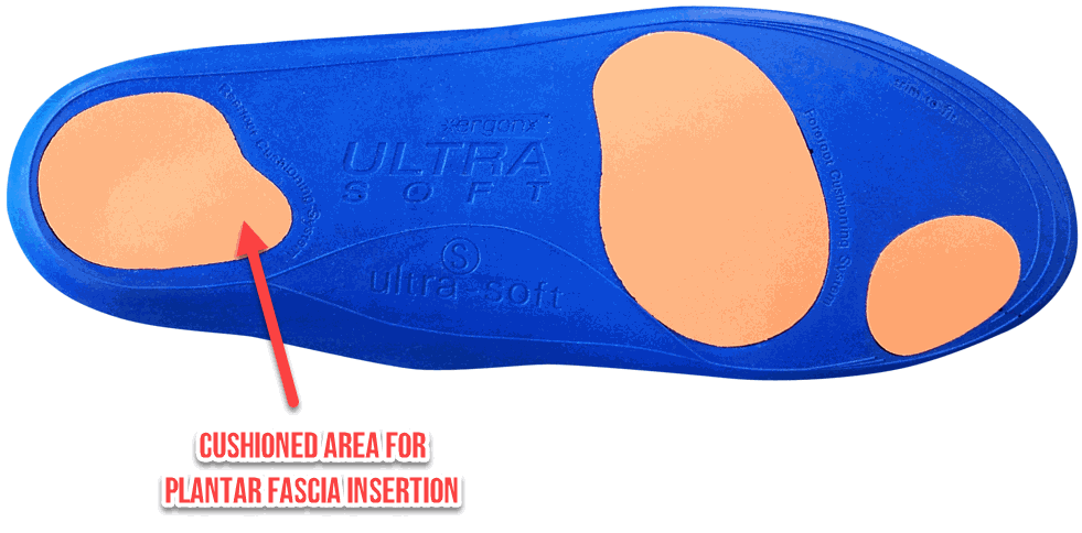 Plantar fasciitis orthotic insoles that cushion the heel help to reduce heel pain by making it more comfortable to walk immediately. The site where the plantar ligament is attached to the heel bone is unfortunately a weight-bearing area of the foot. Up to 4 times your body weight passes through the heel as our heel strikes the ground. By cushioning the location where the plantar ligament attaches in the calcaneus (heel bone), we make the foot more comfortable in those that suffer from plantar fasciitis.