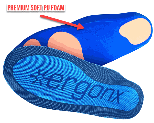 Orthotic insoles for plantar fasciitis should also cushion the entire foot to make the foot more comfortable. By using cushioning Poron pads at the high-impact areas of the foot, we increase cushioning (poron is a great shock absorber)and decrease the weight of the insole (poron is heavy). This makes the foot more comfortable across the day.