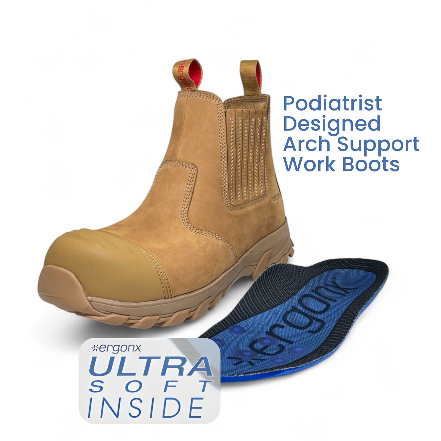 The ultra-soft arch support insole helps to further cushion the foot,  reduces fatigue, and makes our work boots extremely comfortable. By supporting the arches of the feet it helps to rest the supporting ligaments and muscles of the feet.