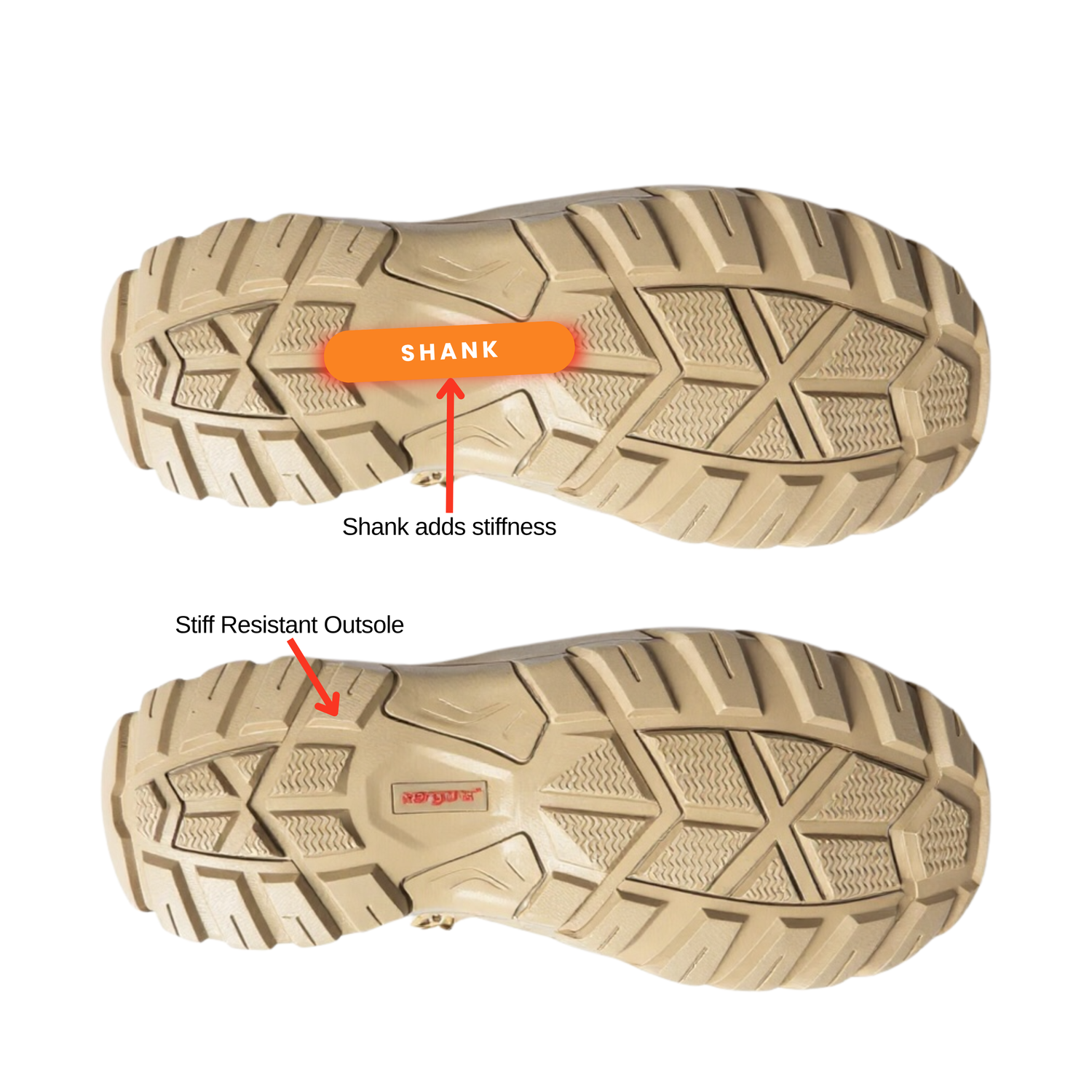 We have modernized the traditional steel shank by changing the material to polypropylene to make it airport friendly and lighter. The shank helps to add stiffness to the boot which helps to reduce strain over the middle of the foot and prevent foot pain.